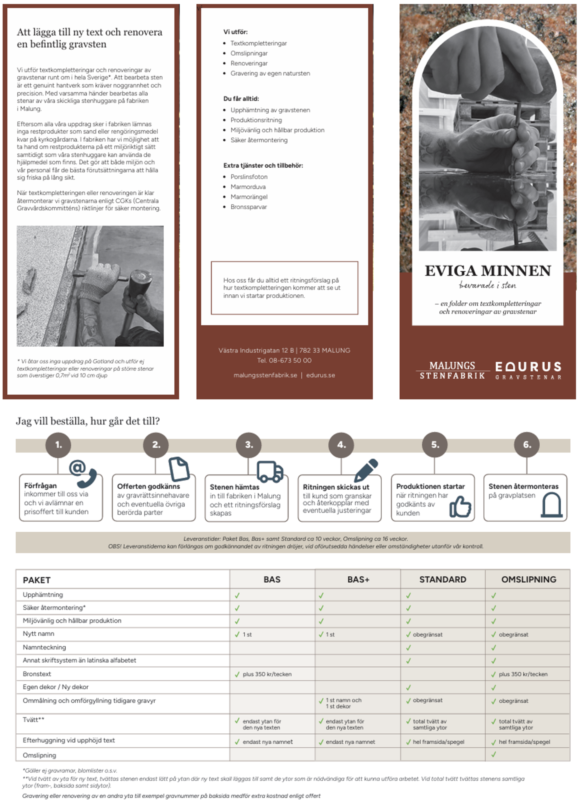 Vi utför uppdrag på kyrkogårdar i hela Sverige. Vid textkomplettering och renovering hämtas stenen till vår fabrik för varsam hantering. Tvätt, ritning och produktion sker i enlighet med befintlig text, gravyr och bearbetningar. Återmontering sker alltid i enlighet med Centrala Gravvårdskommitténs riktlinjer för säker montering.